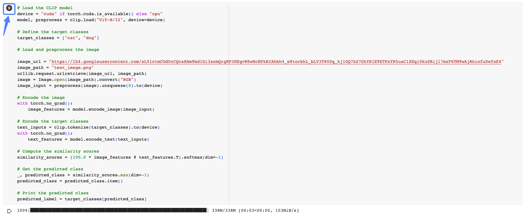 然后在Colab中粘贴后面的代码,并点击播放按钮运行,对image_url中的图片进行分类。