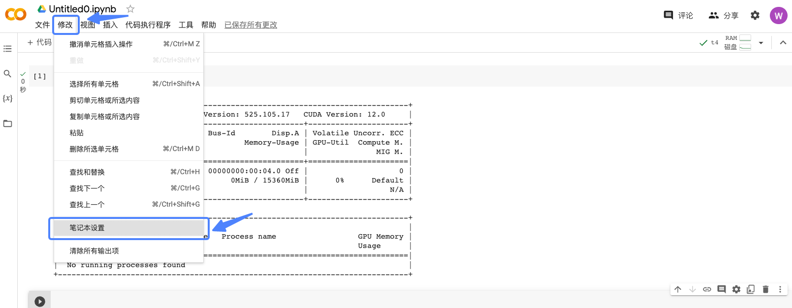之后,我们需要连接GPU环境。点击左上方的修改选项,选择笔记本设置。使用GPU作为硬件加速器,并完成一系列确认操作。
