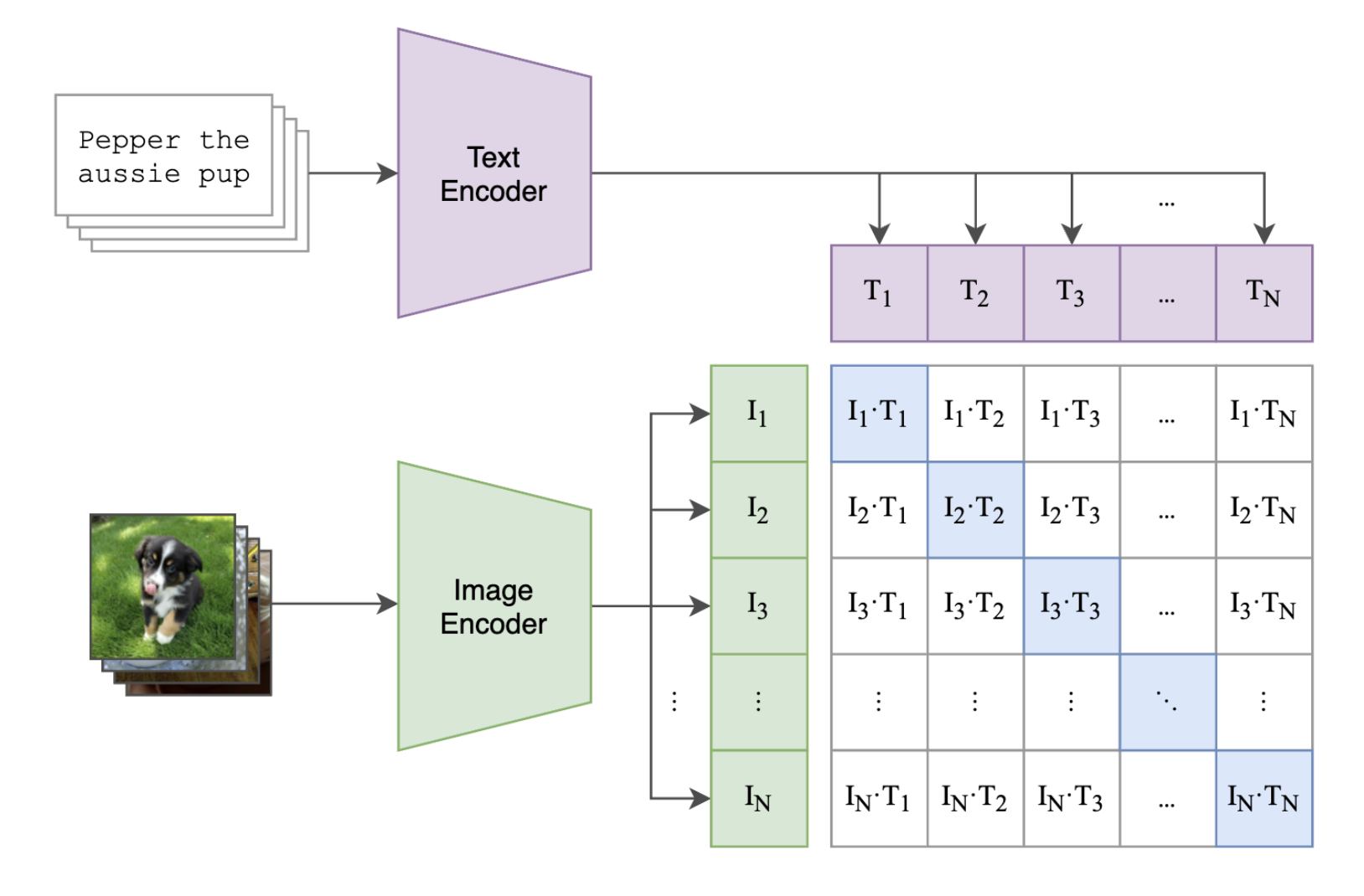 那么此时,我们需要设计一个监督信号,利用图文成对的关系,驱动两个编码器模型学习到有效的特征提取能力。该怎么做呢?