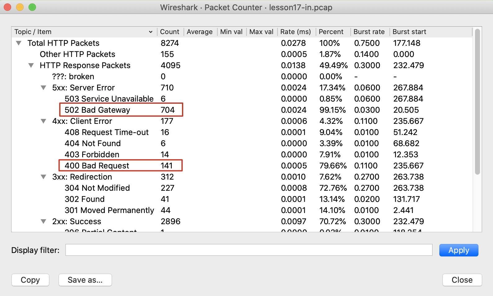 1 | $ tshark -r lesson17-in.pcap -T fields -e http.response.code | grep -v ^$ | sort | uniq -c | sort -r |