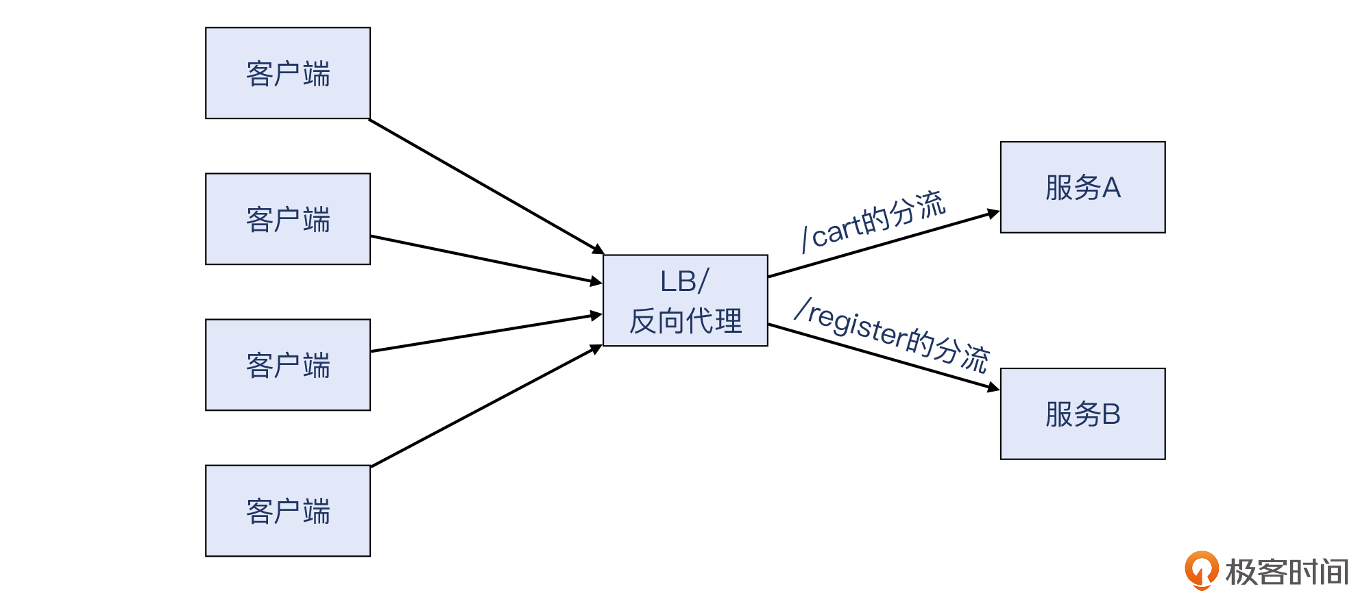 你可能也看出来了,502/503/504这几个返回码,都是给 反向代理 / LB 用的。反向代理 / LB位于客户和服务之间,起到了转发、分流、处理的作用。这里我稍微再给你展开一下这几类功能。