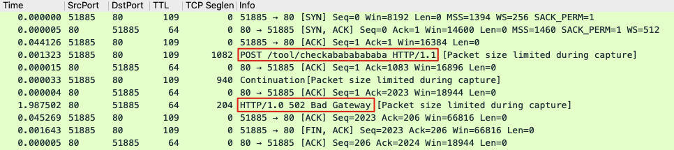 一个POST请求,得到了HTTP 502,这并不正常,会不会跟这个奇怪的前端问题有关系呢?由于这只是客户侧的情况,我们必须跑到云LB的另外一侧即服务侧,看看那边发生了什么。分析那边的数据包,也许就能定位到502产生的原因了。