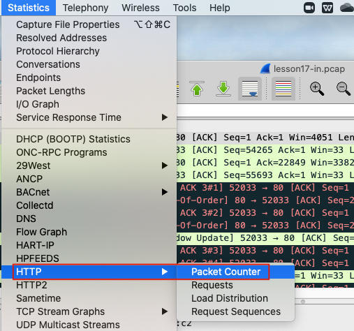 当然,你用Wireshark图形界面也很容易获得这种信息。在Wireshark的Statistics下拉菜单里,选择HTTP -> Packet Counter: