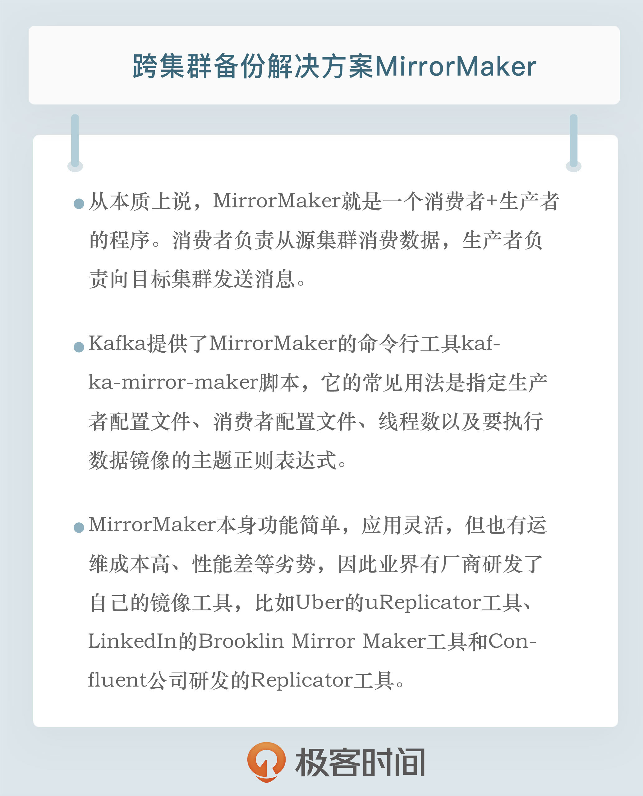好了,我们总结一下今天所讲的MirrorMaker。它是Apache Kafka社区提供的跨集群镜像解决方案,主要实现将Kafka消息实时从一个集群同步复制或镜像到另一个集群。你可以把MirrorMaker应用到很多实际的场景中,比如数据备份、主备集群等。MirrorMaker本身功能简单,应用灵活,但也有运维成本高、性能差等劣势,因此业界有厂商研发了自己的镜像工具。你可以根据自身的业务需求,选择合适的工具来帮助你完成跨集群的数据备份。