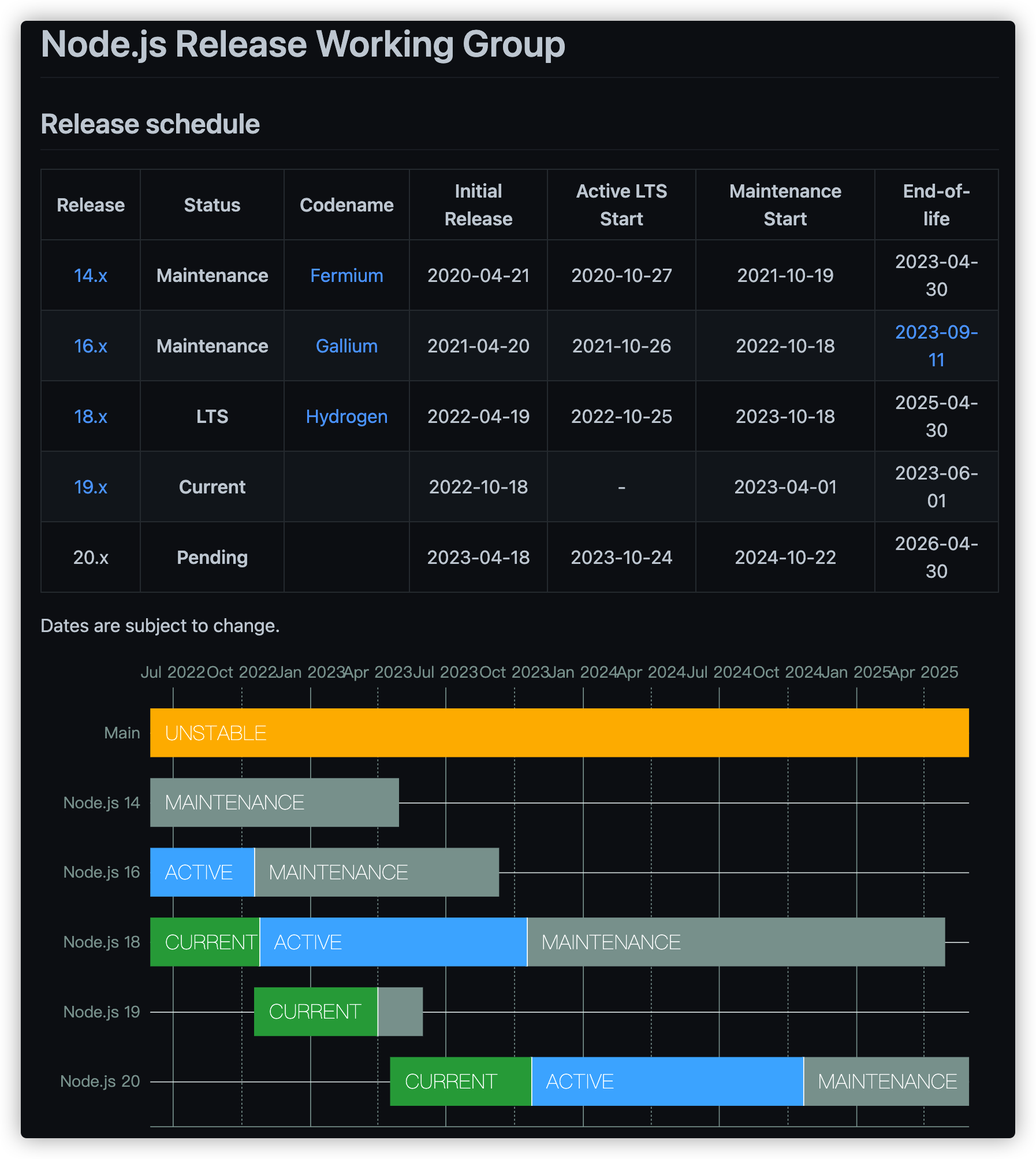 而且,每个大版本号都有对应维护的排期(截图来自 Node.js 的 GitHub 官方文档)。