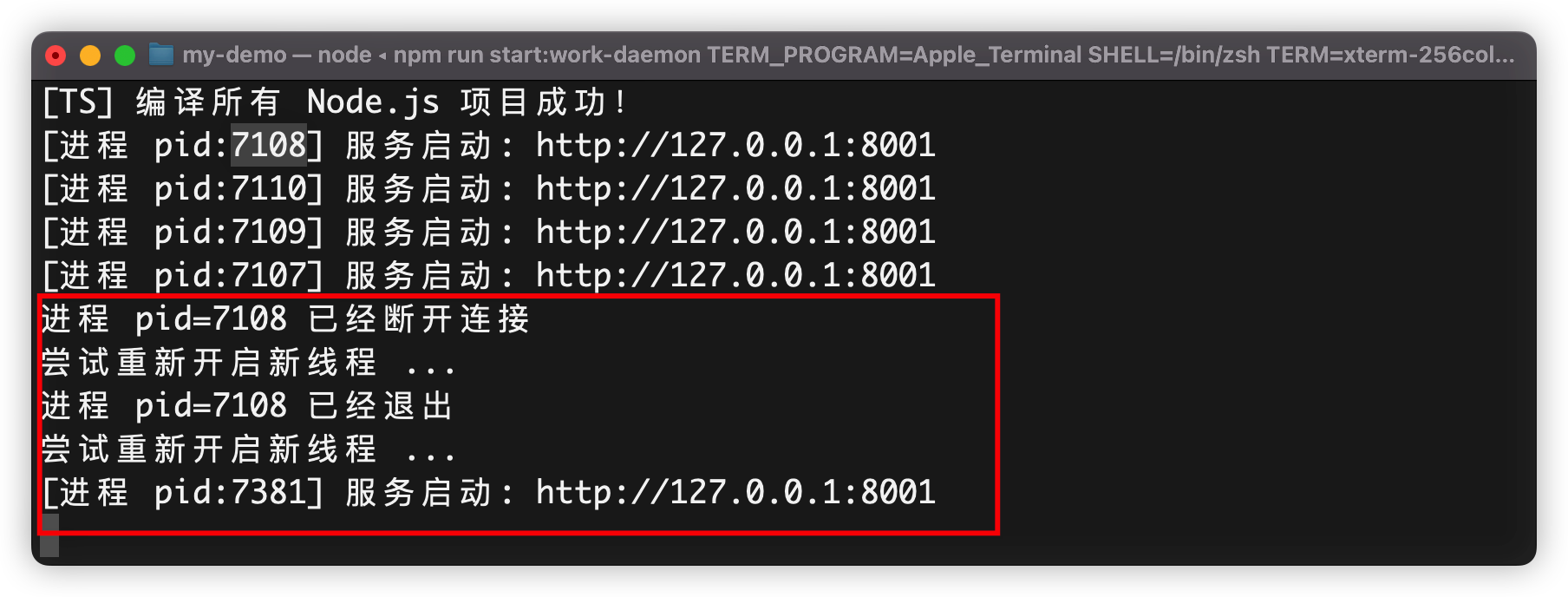 基于这个案例,我们可以测试一下。在开启多进程后,根据进程id,我们强制退出进程。当子进程被强制退出后,看一看,守护进程是否会收到通信消息,自动开启新的进程。