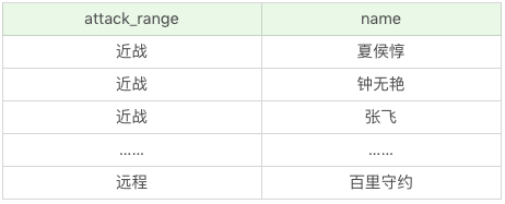 这是运行结果(2条记录),这样我们就能直观地看到攻击范围其实只有两个值,那就是近战和远程。