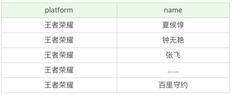 1 | SQL:SELECT '王者荣耀' as platform, name FROM heros |