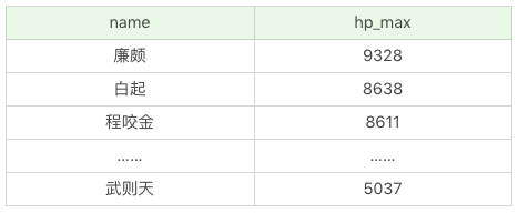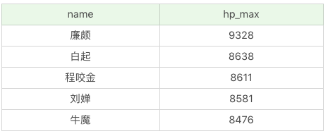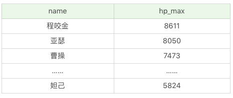 1 | SQL:SELECT name, hp_max FROM heros ORDER BY hp_max DESC |