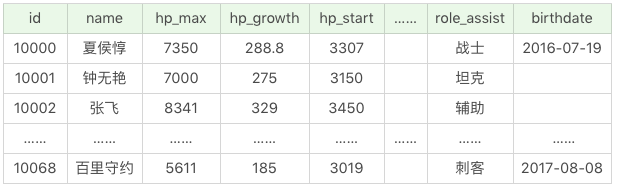 我创建了一个王者荣耀英雄数据表,这张表里一共有69个英雄,23个属性值(不包括英雄名name)。SQL文件见Github地址。