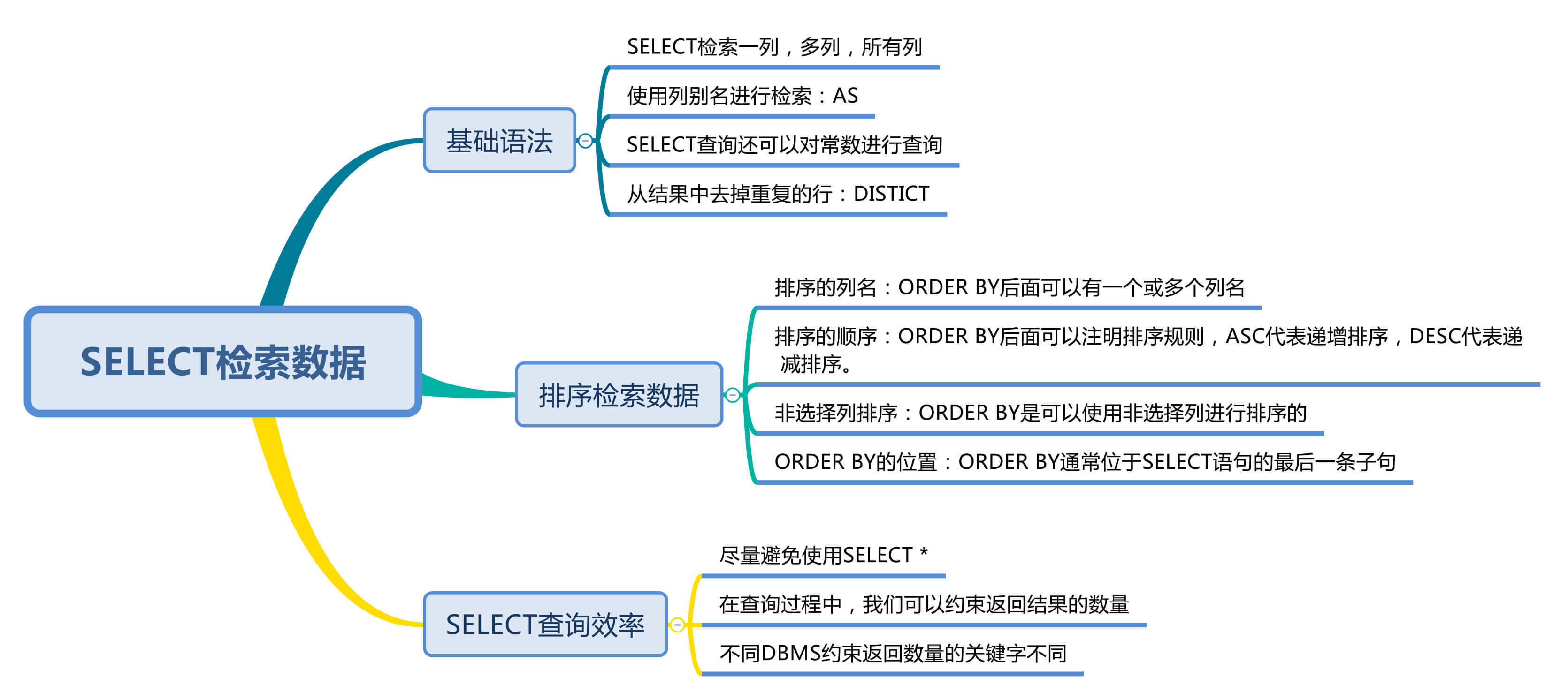 SELECT可以帮助我们从一个表或多个表中进行数据查询。我们知道一个数据表是由列(字段名)和行(数据行)组成的,我们要返回满足条件的数据行,就需要在SELECT后面加上我们想要查询的列名,可以是一列,也可以是多个列。如果你不知道所有列名都有什么,也可以检索所有列。