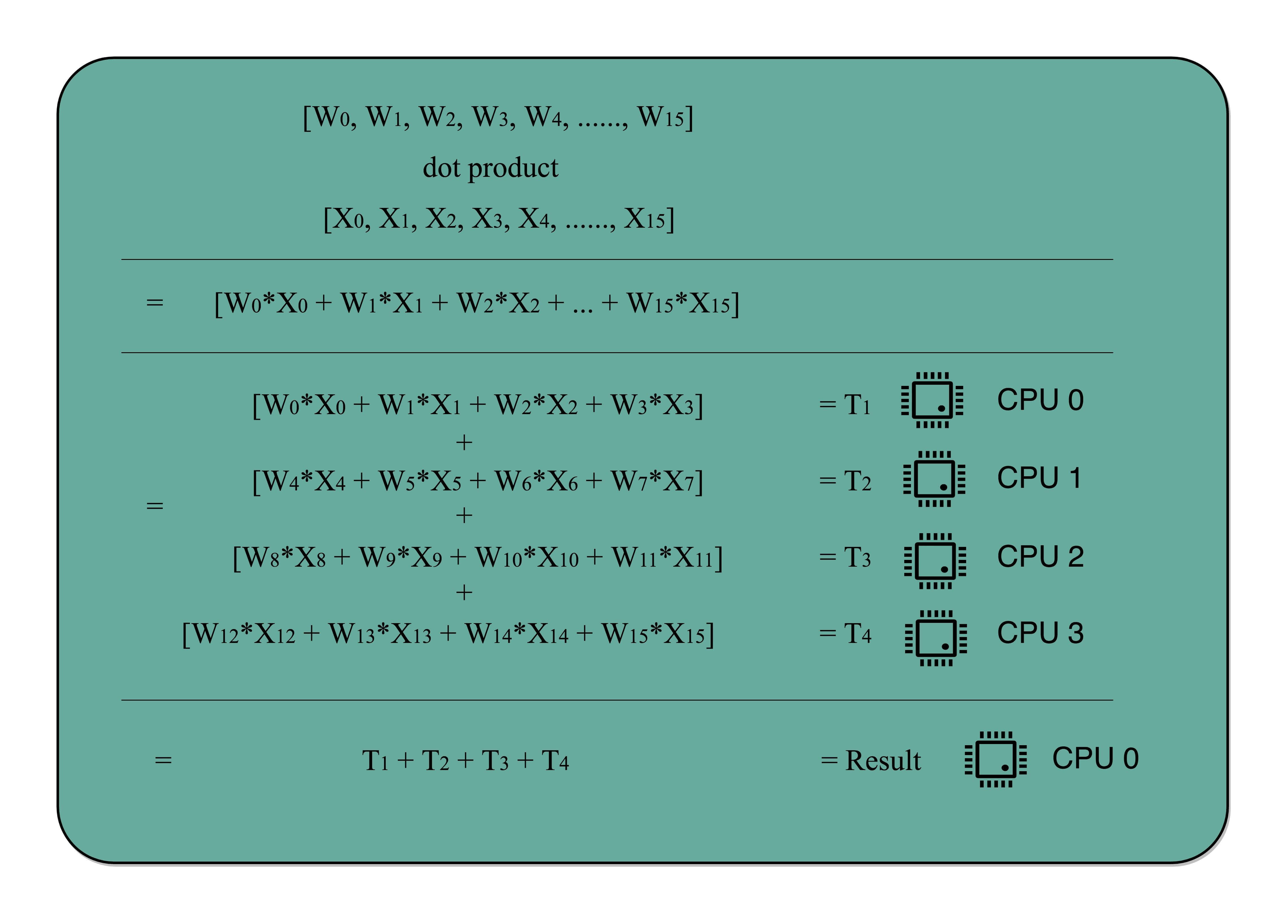 这个思想在很多地方都可以使用。举个例子,我们做机器学习程序的时候,需要计算向量的点积,比如向量$W = [W_0, W_1, W_2, …, W_{15}]$和向量 $X = [X_0, X_1, X_2, …, X_{15}]$,$W·X = W_0 * X_0 + W_1 * X_1 +$ $W_2 * X_2 + … + W_{15} * X_{15}$。这些式子由16个乘法和1个连加组成。如果你自己一个人用笔来算的话,需要一步一步算16次乘法和15次加法。如果这个时候我们把这个任务分配给4个人,同时去算$W_0~W_3$, $W_4~W_7$, $W_8~W_{11}$, $W_{12}~W_{15}$这样四个部分的结果,再由一个人进行汇总,需要的时间就会缩短。