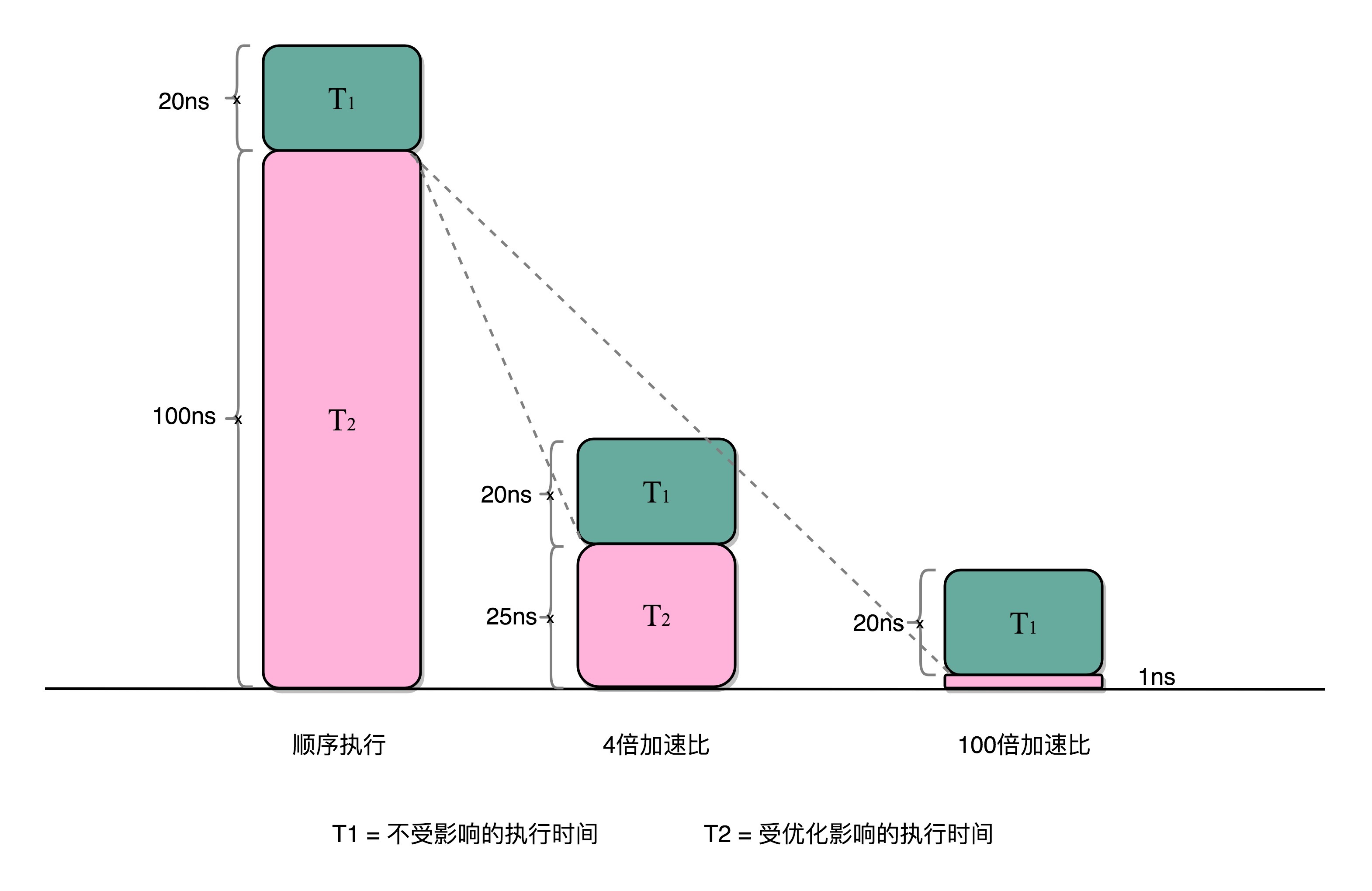 在刚刚的向量点积例子里,4个人同时计算向量的一小段点积,就是通过并行提高了这部分的计算性能。但是,这4个人的计算结果,最终还是要在一个人那里进行汇总相加。这部分汇总相加的时间,是不能通过并行来优化的,也就是上面的公式里面不受影响的执行时间这一部分。