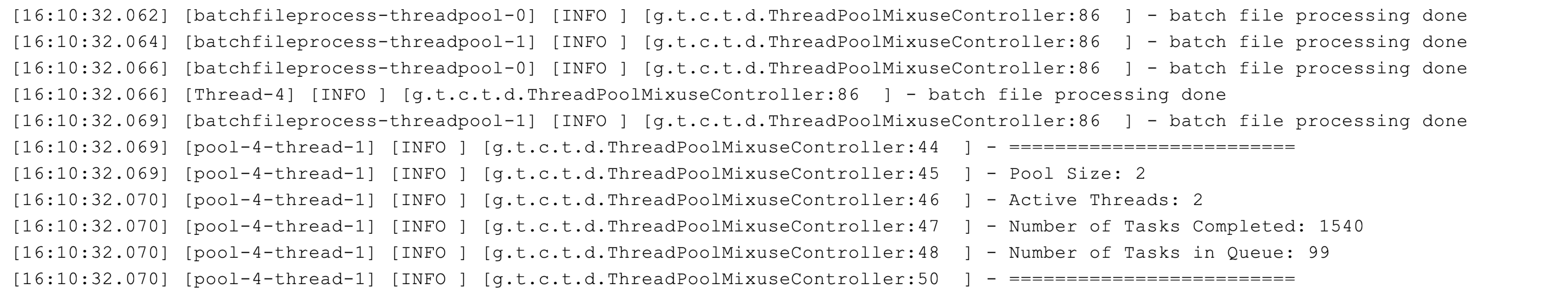 这里,我们模拟一下文件批处理的代码,在程序启动后通过一个线程开启死循环逻辑,不断向线程池提交任务,任务的逻辑是向一个文件中写入大量的数据: