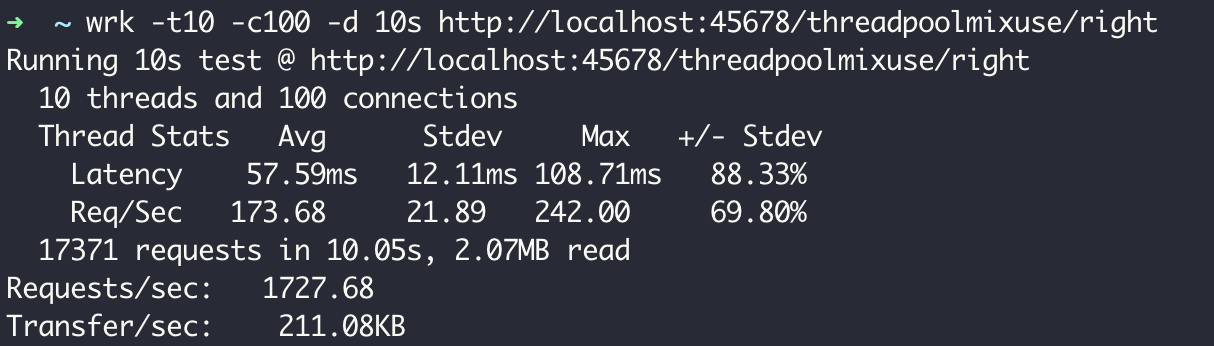 使用单独的线程池改造代码后再来测试一下性能,TPS提高到了1727: