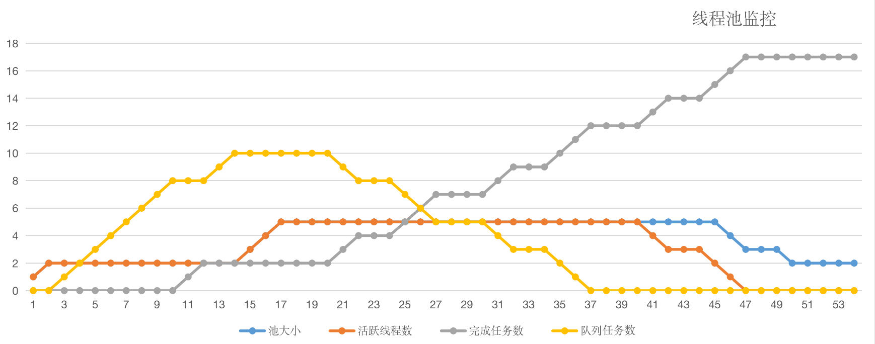 可以看到,**线程池的2个线程始终处于活跃状态,队列也基本处于打满状态。**因为开启了CallerRunsPolicy拒绝处理策略,所以当线程满载队列也满的情况下,任务会在提交任务的线程,或者说调用execute方法的线程执行,也就是说不能认为提交到线程池的任务就一定是异步处理的。如果使用了CallerRunsPolicy策略,那么有可能异步任务变为同步执行。从日志的第四行也可以看到这点。这也是这个拒绝策略比较特别的原因。