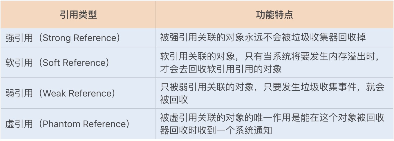 以上两种算法都是通过引用来判断对象是否可以被回收。在 JDK 1.2 之后,Java 对引用的概念进行了扩充,将引用分为了以下四种: