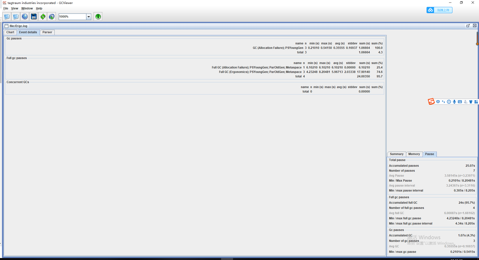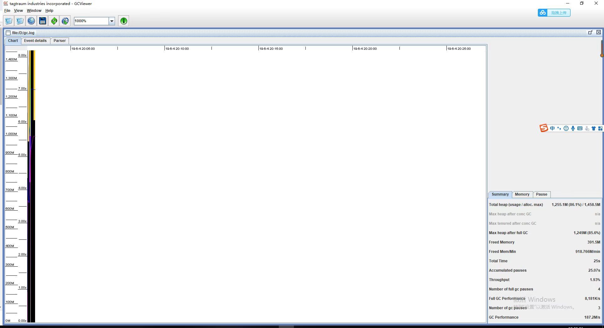 上图是运行很短时间的GC日志,如果是长时间的GC日志,我们很难通过文本形式去查看整体的GC性能。此时,我们可以通过GCViewer工具打开日志文件,图形化界面查看整体的GC性能,如下图所示: