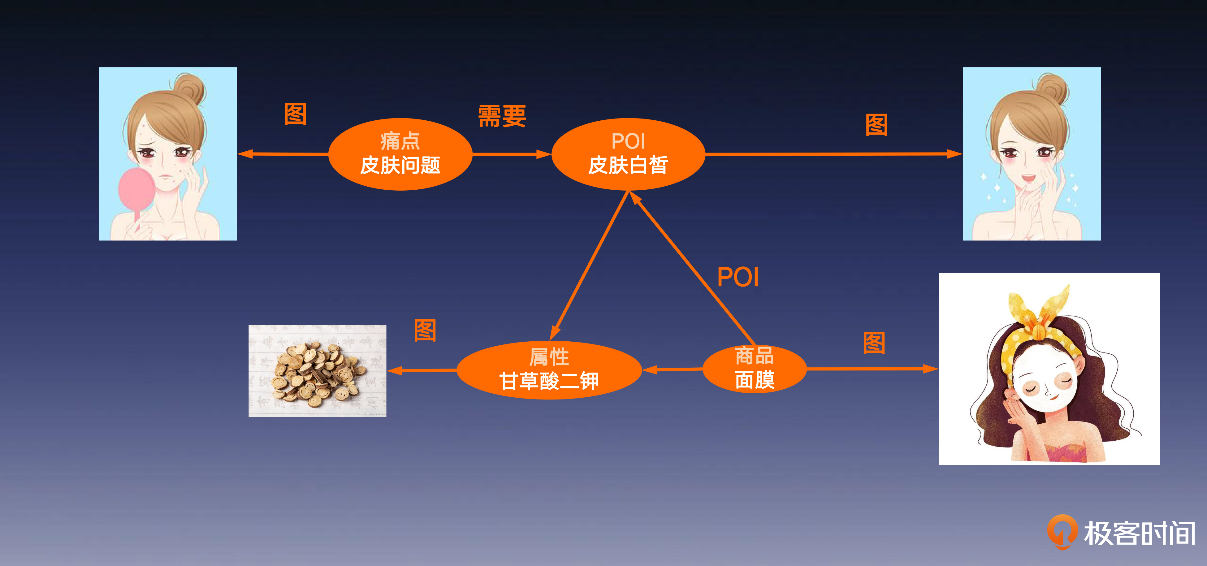 清楚了各个步骤的定位之后,我再带你学习一个知识图谱应用的例子,帮你建立一些直观的认识。在AIRC系统中,我们常常利用知识图谱来对物品、相关信息和用户之间的关系进行建模,从而获取“物品地图”中的各个兴趣点(Point of Interest,POI),挖掘用户各个兴趣中潜在的关联内容。