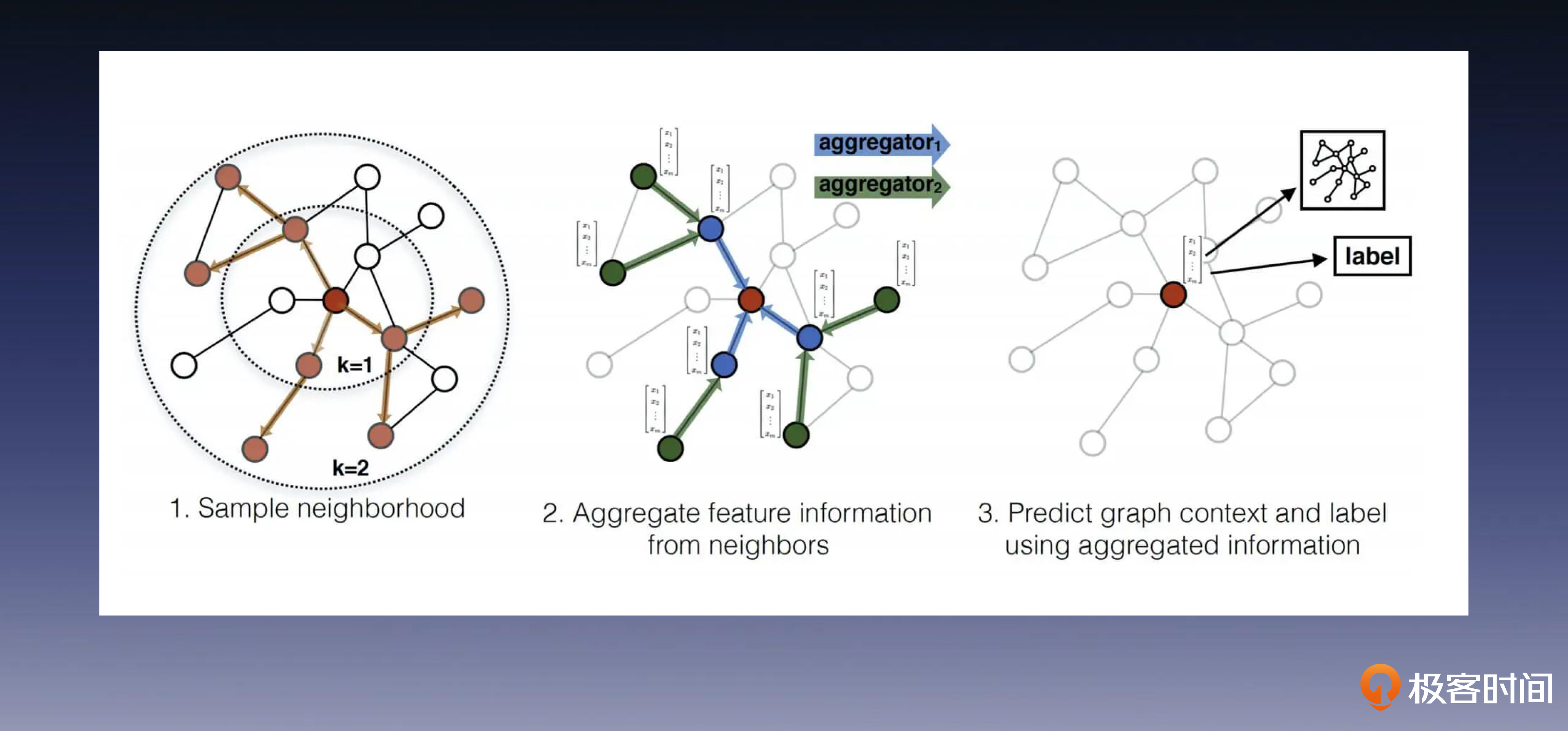 这里先简单提一下,这些步骤背后的思想其实和大模型技术 Transformer 中的位置编码很像,到时候我会再和你详细讲解。这里我们回到 GraphSage 算法。