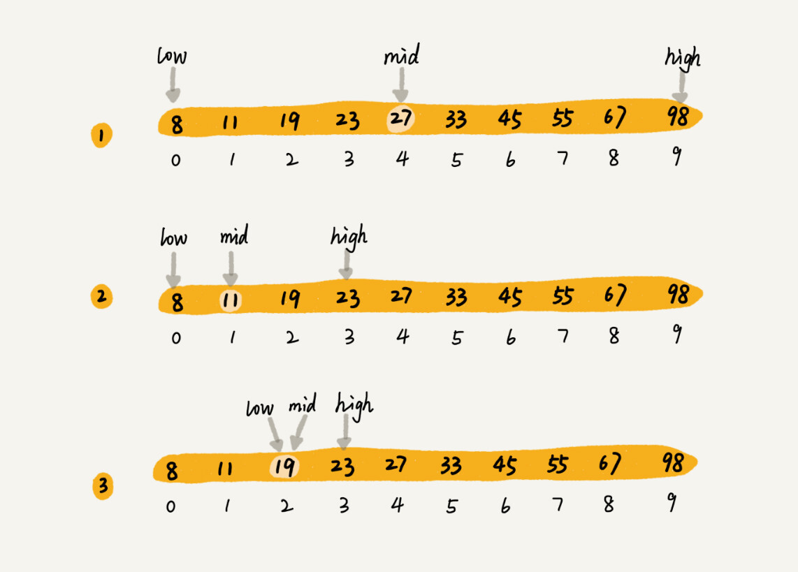 还是利用二分思想,每次都与区间的中间数据比对大小,缩小查找区间的范围。为了更加直观,我画了一张查找过程的图。其中,low和high表示待查找区间的下标,mid表示待查找区间的中间元素下标。