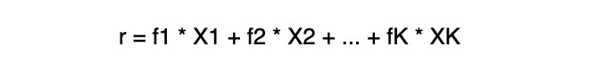 - 线性多因子模型的数学形式:r = f1 * X1 + f2 * X2 + … + fK * XK。