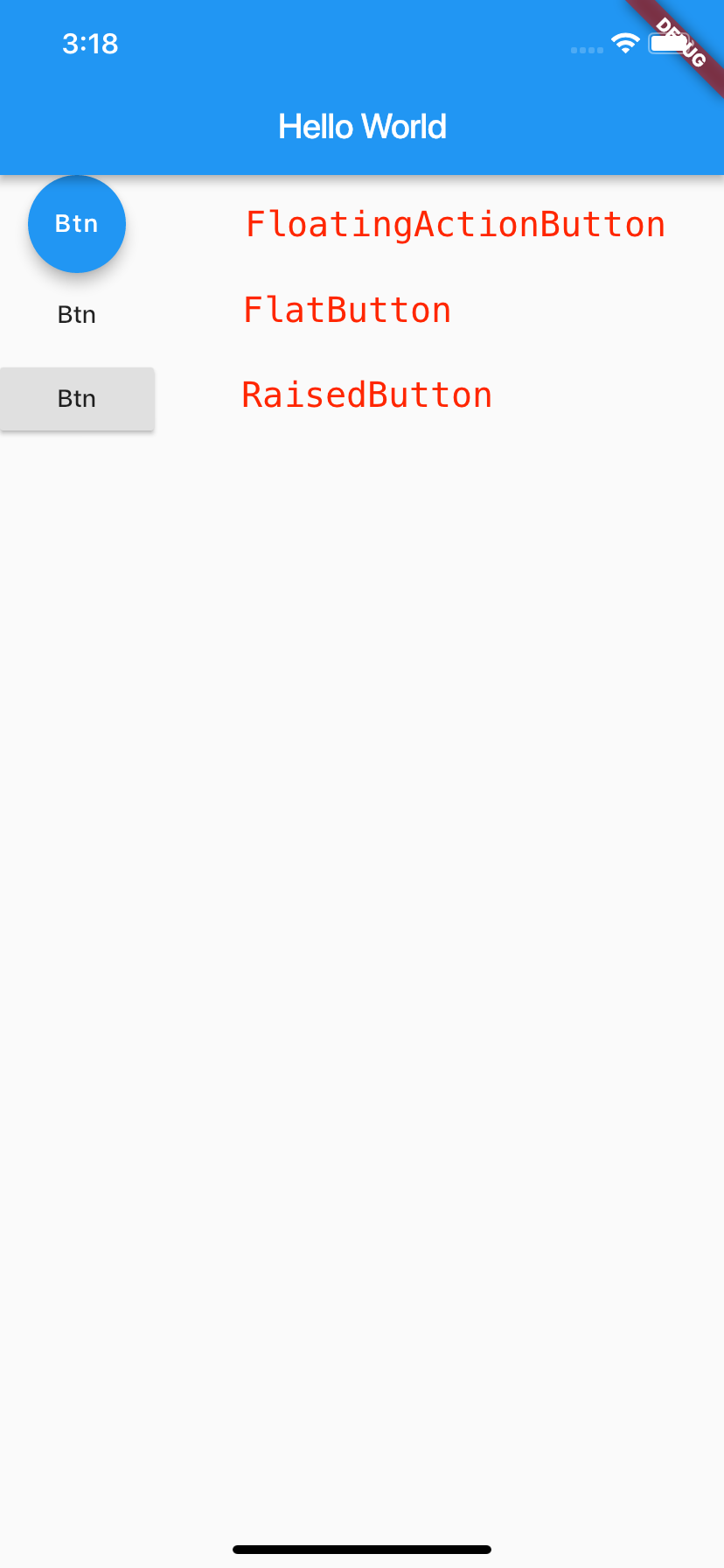 下述代码中,我分别定义了FloatingActionButton、FlatButton与RaisedButton,它们的功能完全一样,在点击时打印一段文字: