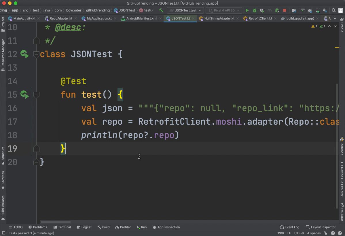 空安全 因为,我们还有一个问题没有解决:**如果服务端返回的JSON字段是null的话,我们的程序仍然会出错。**具体来说,我们可以用这个单元测试来模拟。