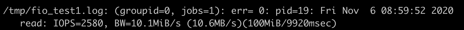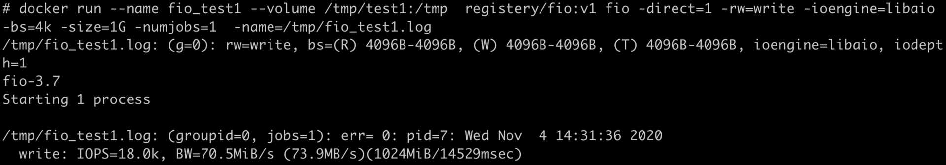 有了这个带fio的镜像,我们可以用它启动一个容器,在容器中运行fio,就可以得到只有一个容器读写磁盘时的性能数据。