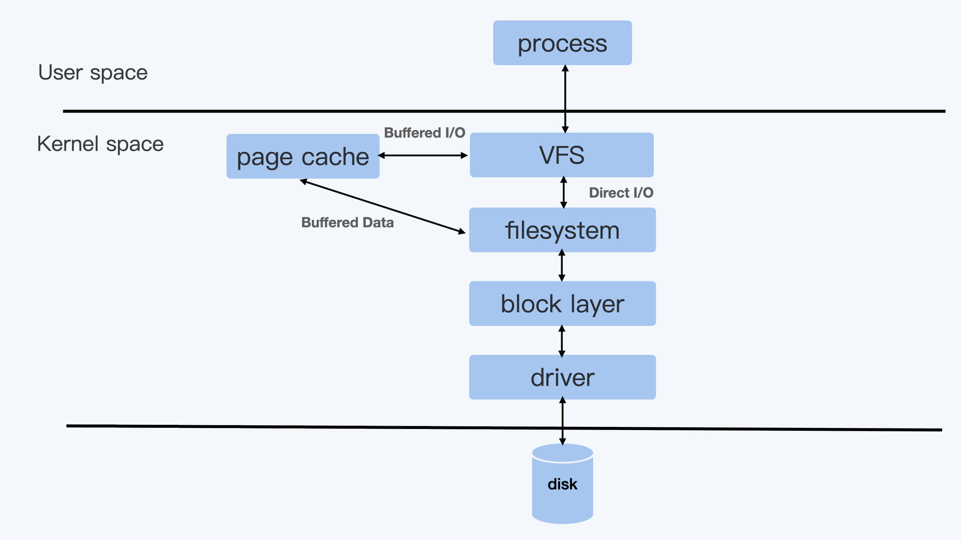 Direct I/O 模式,用户进程如果要写磁盘文件,就会通过Linux内核的文件系统层(filesystem) -> 块设备层(block layer) -> 磁盘驱动 -> 磁盘硬件,这样一路下去写入磁盘。
