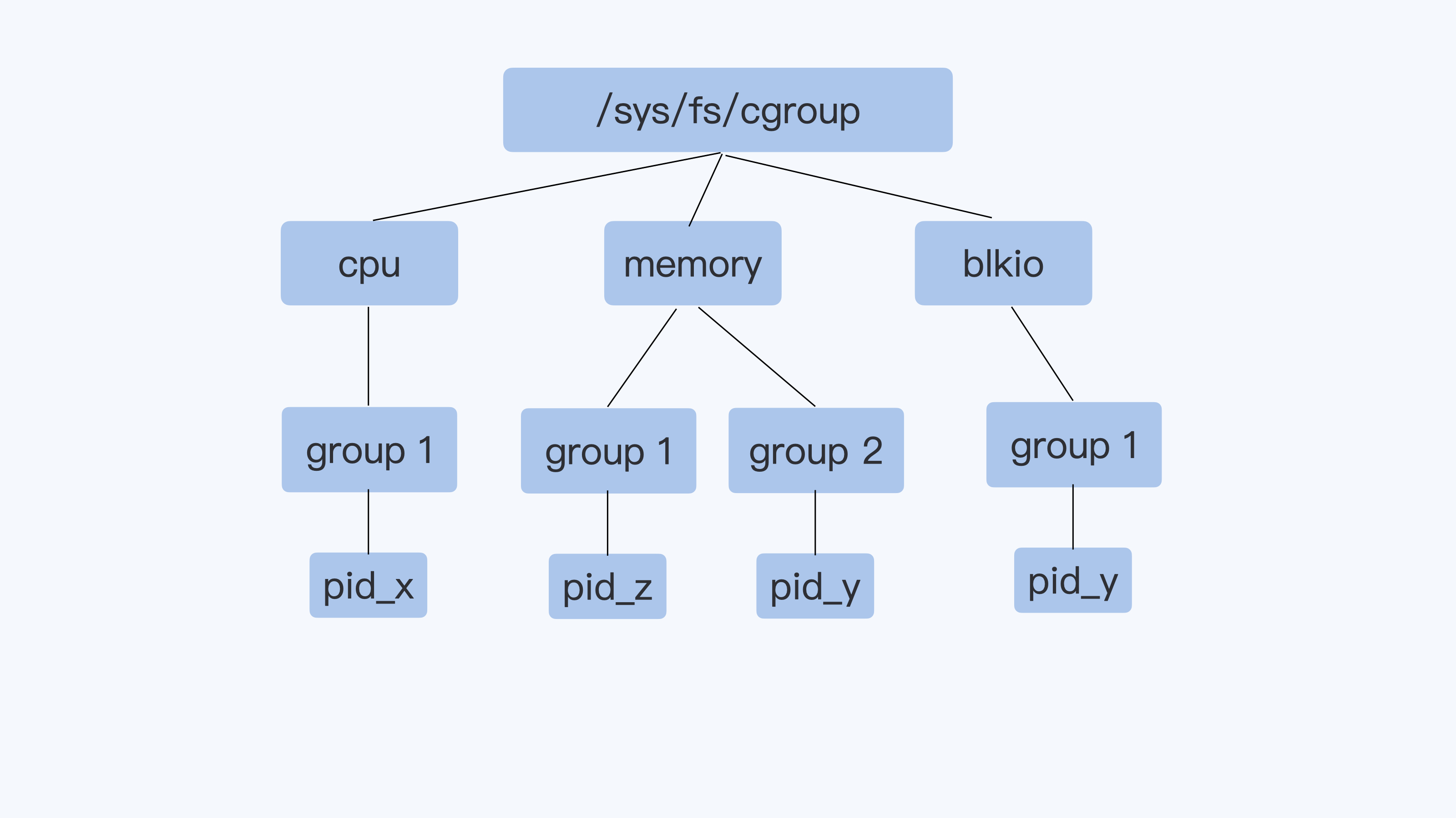 我们已经学习过了v1 的CPU Cgroup,memory Cgroup和blkio Cgroup,那么Cgroup v1的一个整体结构,你应该已经很熟悉了。它的每一个子系统都是独立的,资源的限制只能在子系统中发生。