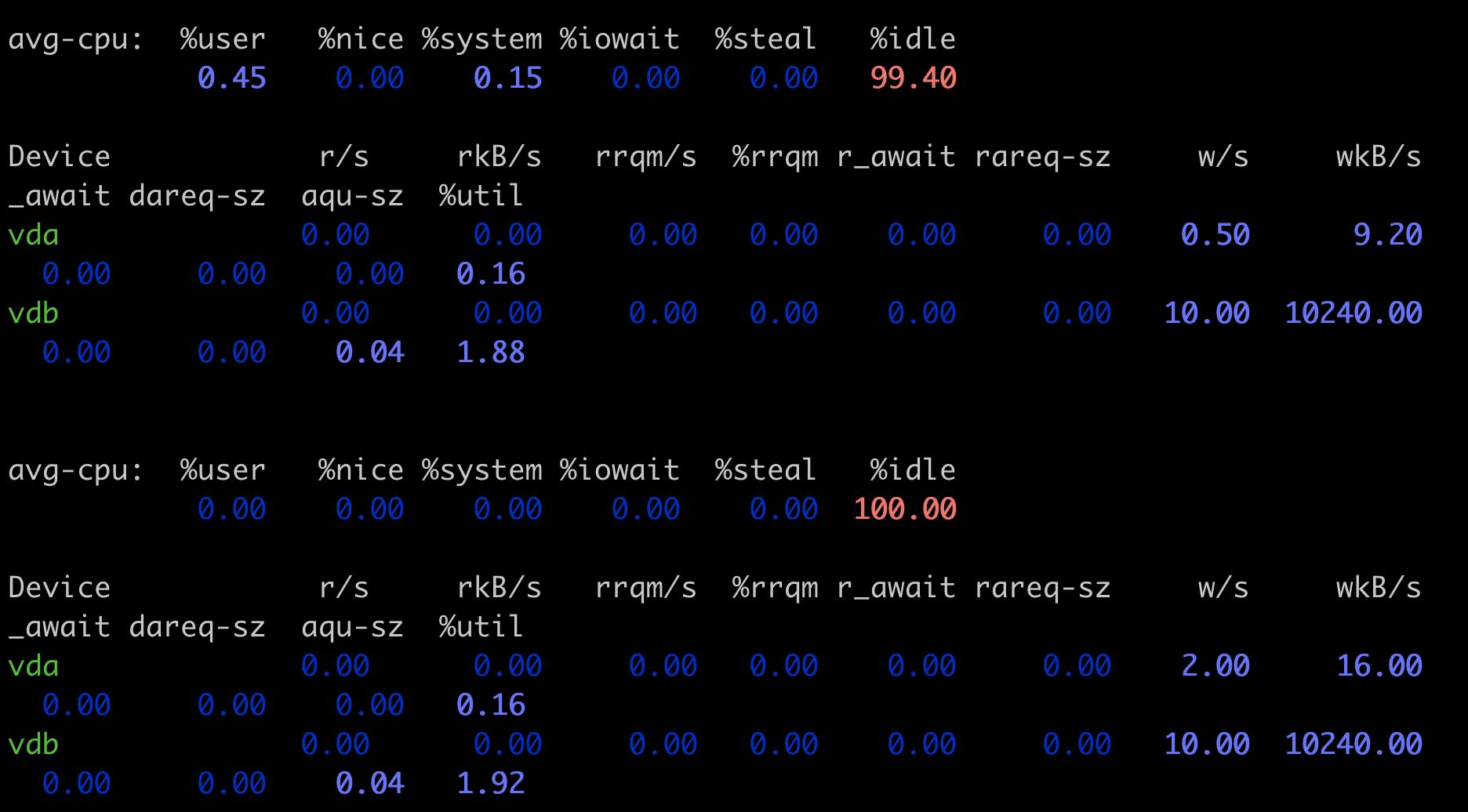 运行fio写入1GB的数据后,你会发现fio马上就执行完了,因为系统上有足够的内存,fio把数据写入内存就返回了,不过只要你再运行”iostat -xz 10” 这个命令,你就可以看到磁盘vdb上稳定的写入速率是10240wkB/s,也就是我们在io Cgroup里限制的10MB/s。