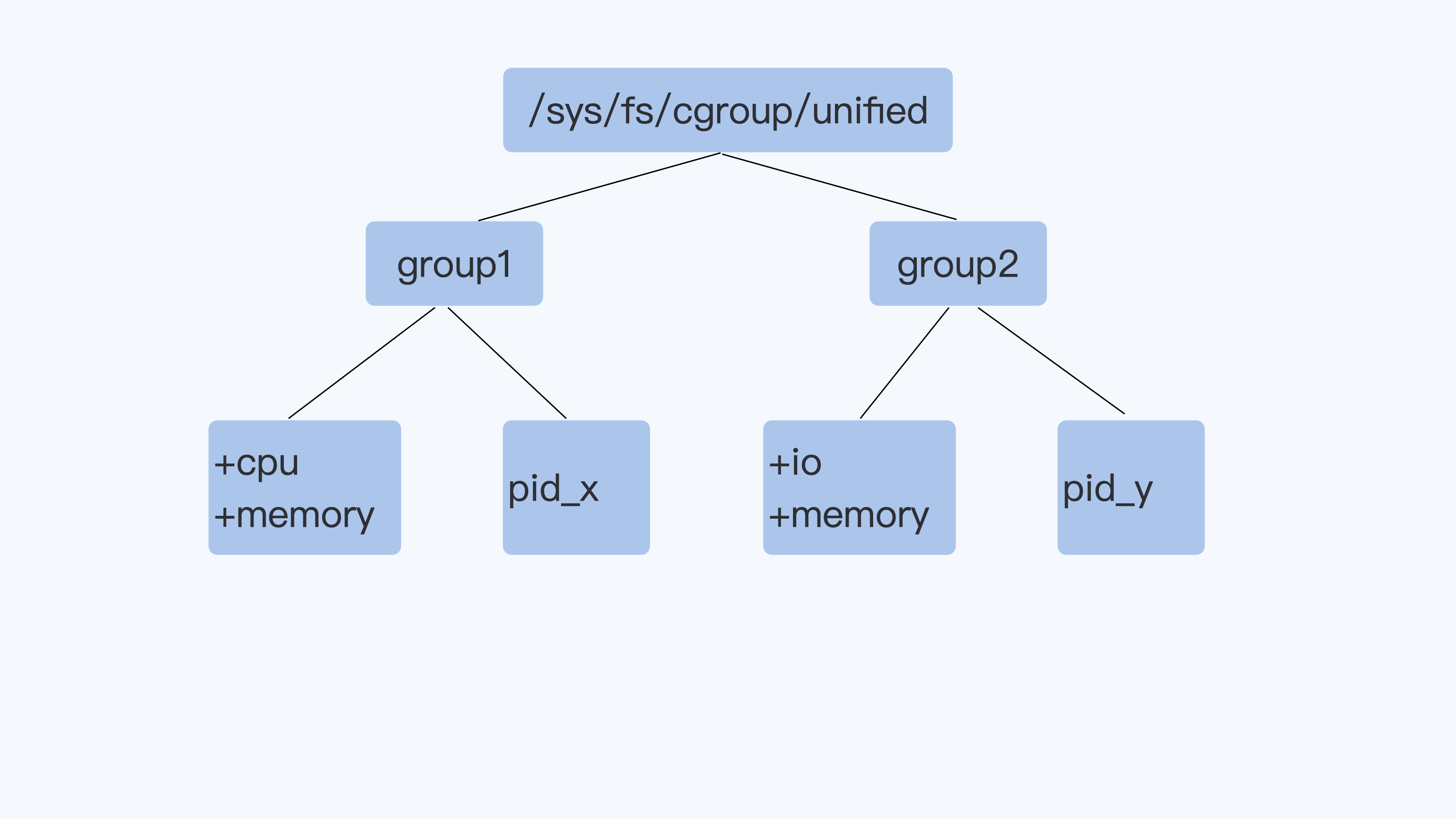 比如下面的Cgroup V2示意图里,进程pid_y属于控制组group2,而在group2里同时打开了io和memory子系统 (Cgroup V2里的io子系统就等同于Cgroup v1里的blkio子系统)。