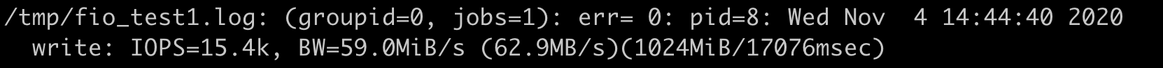 这时候,我们看到的结果,在容器fio_test1里,IOPS是15K左右,带宽是59MB/s了,比之前单独运行的时候性能下降了不少。