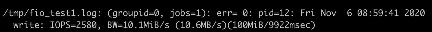 然后在启动容器之后,我们直接运行fio的命令,这里的参数和我们[第11讲]最开始的例子差不多,只是这次我们运行的是write,也就是写磁盘的操作,而写的目标盘就是挂载到/tmp目录的volume。