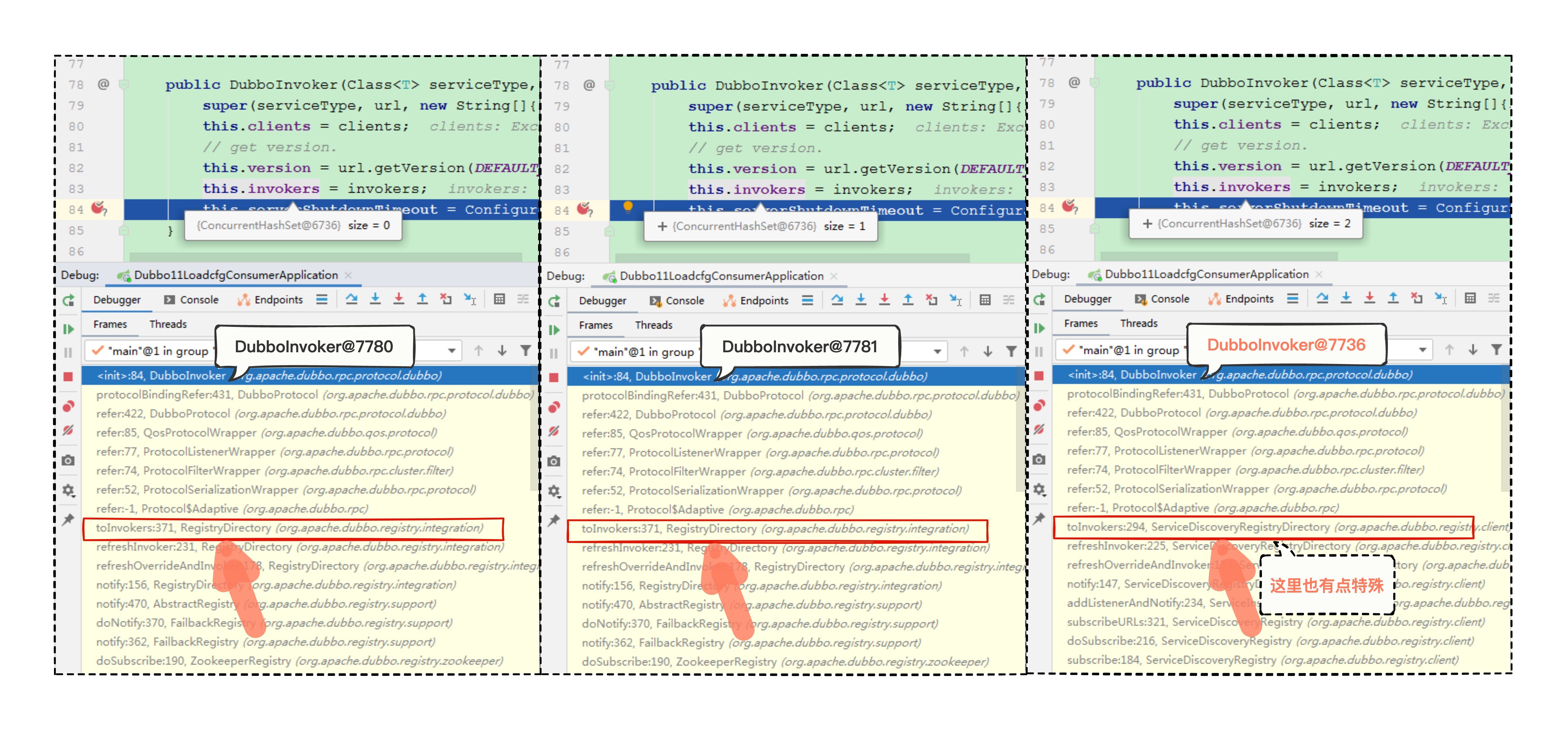 发现断点进入了多次,每次 invokers 都会增加一个,奇怪的是,有 1 次调用堆栈显示了 ServiceDiscoveryRegistryDirectory 这么一个类,这不就是 Dubbo 新版本的服务发现应用级订阅?而且当前 DubboInvoker 的 this 引用正好是这个服务发现的引用,难道 Dubbo 框架从 invokers 中选择了新版本的服务发现实例么?