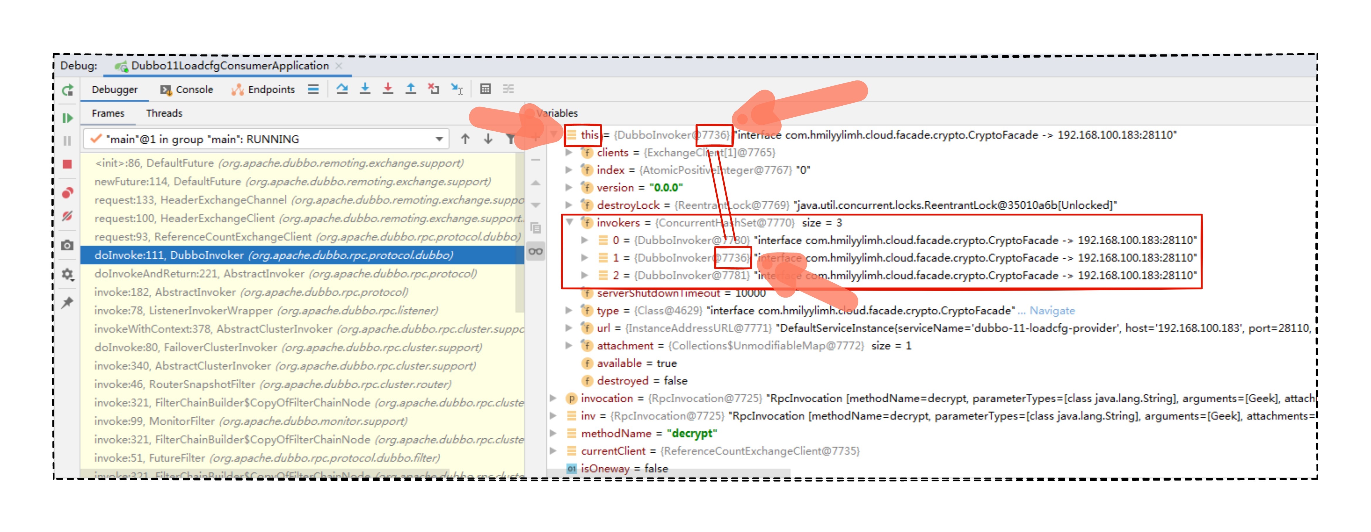 奇怪的是,看红框可以发现当前 DubboInvoker 的 this 引用在 invokers 当中,而且 invokers 中的另外两个元素也是 DubboInvoker 类型的,我们根本看不出这3个元素有什么区别,难道 Dubbo 框架随机选择了 invokers 中的一个元素进行调用的么?