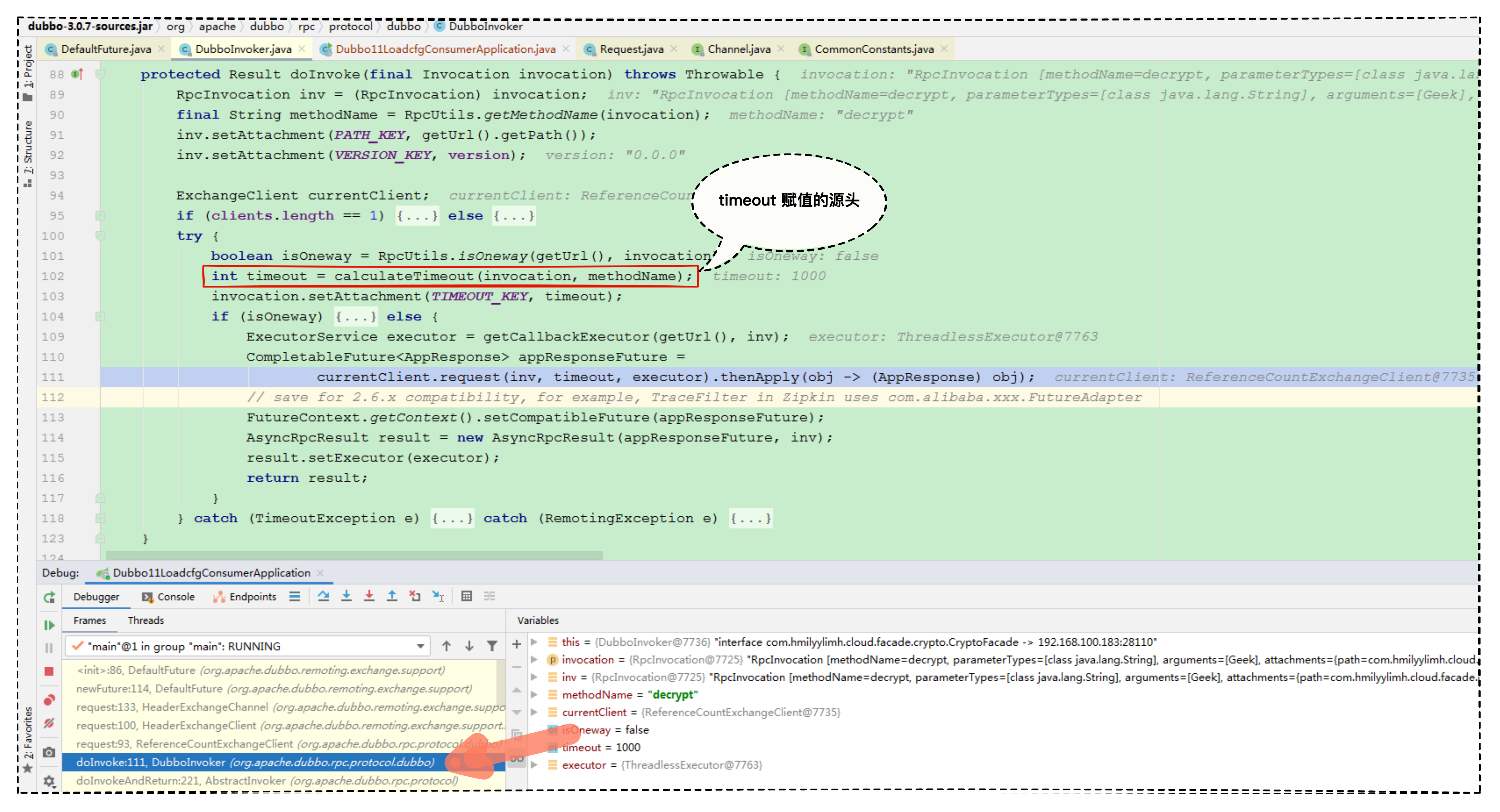 由于目前 Debug 运行时使用的 DubboInvoker 是新版本的服务发现实例,而且提供方加解密服务的 @DubboService 注解中没有配置任何超时时间,消费方的 XML 配置文件中也没有配置任何超时时间,这样一来,正好符合图中拿不到任何 timeout 参数值的现象,也就是说,拿到的是一个 null 。