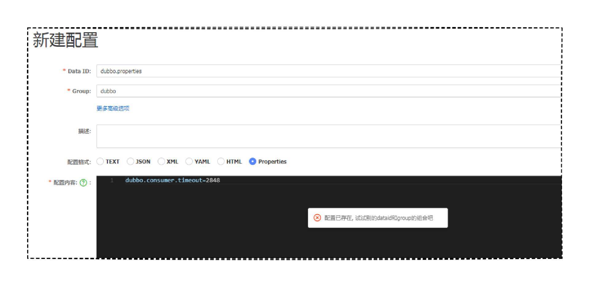 再次新建一条记录,内容为 dataId = dubbo.properties,group = dubbo,添加完再点击提交就报错了,你知道这是为什么吗?