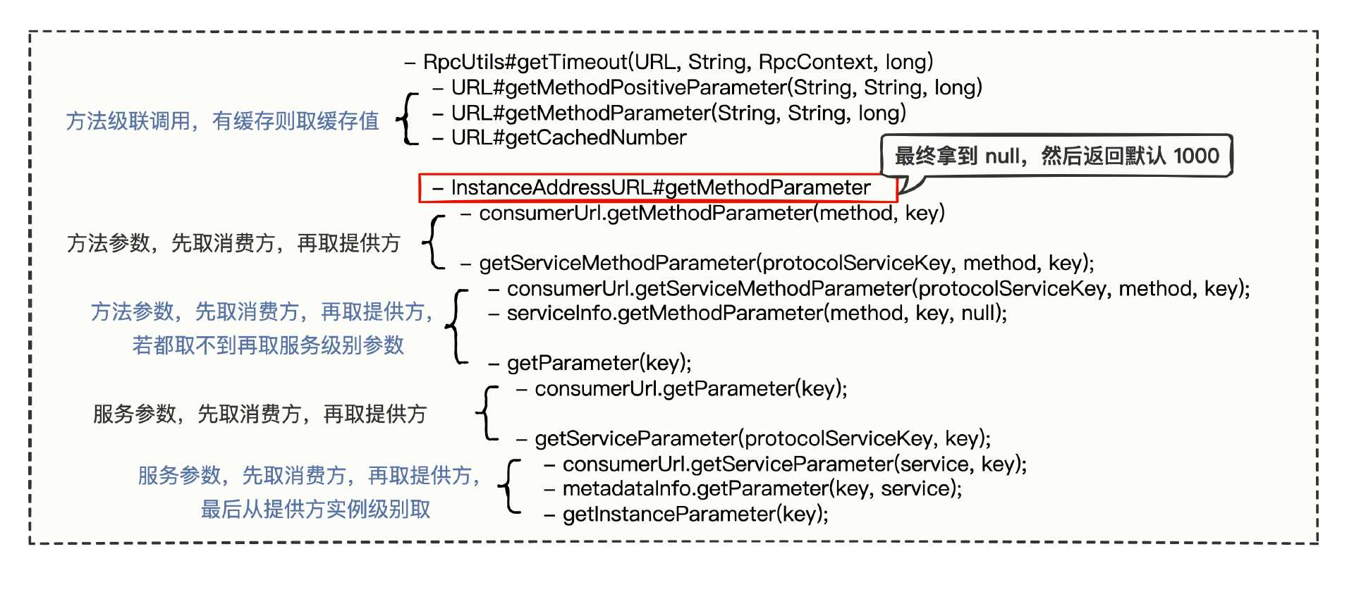 调用流程整体分为三大块,先取方法级别的参数,再取服务级别的参数,最后取实例级别的参数;在每一块的内部按照先取消费方,再提供方的顺序读取参数。