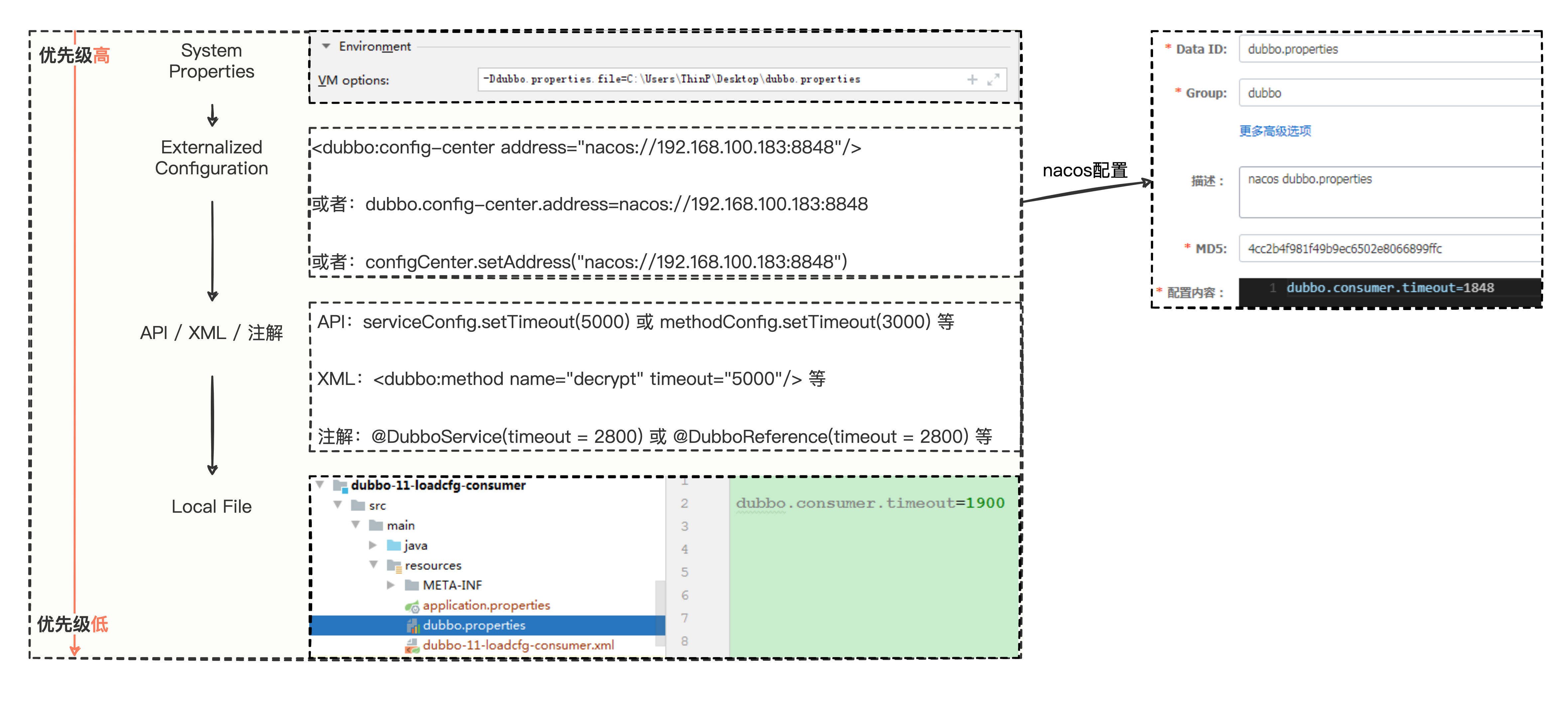 Dubbo 配置的四层覆盖关系,优先级从高到低依次为:System Properties、Externalized Configuration、API / XML / 注解、Local File。