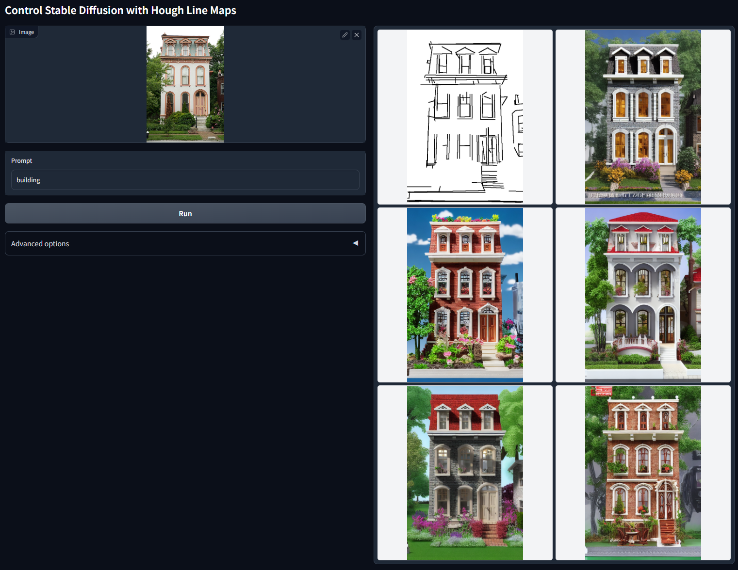 下一个是MLSD条件,它使用 M-LSD算法 提取图像的直线轮廓,可以用于各种建筑图像和室内装饰场景的可控生成。