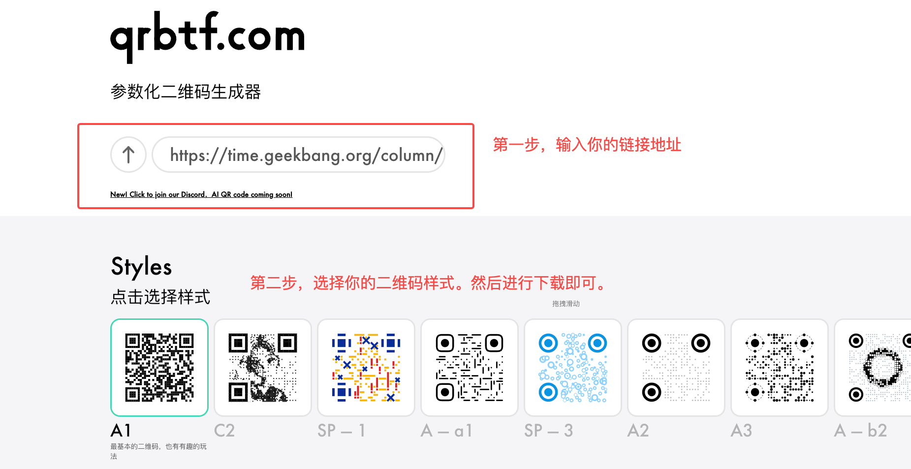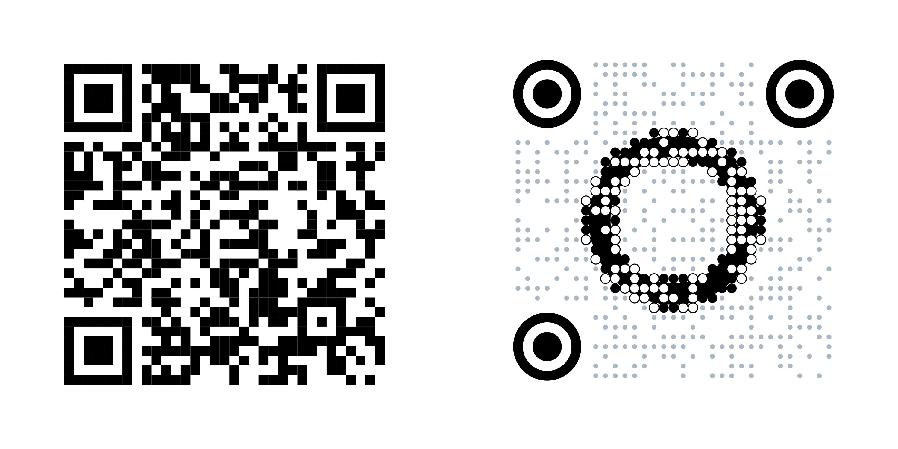 这样的二维码该如何设计呢?首先需要准备一个原始的二维码图像。比如对于我们的课程链接,我们可以任意选择一个二维码生成工具,生成一张二维码。比如这里我使用链接中的工具,生成了两款原始二维码。