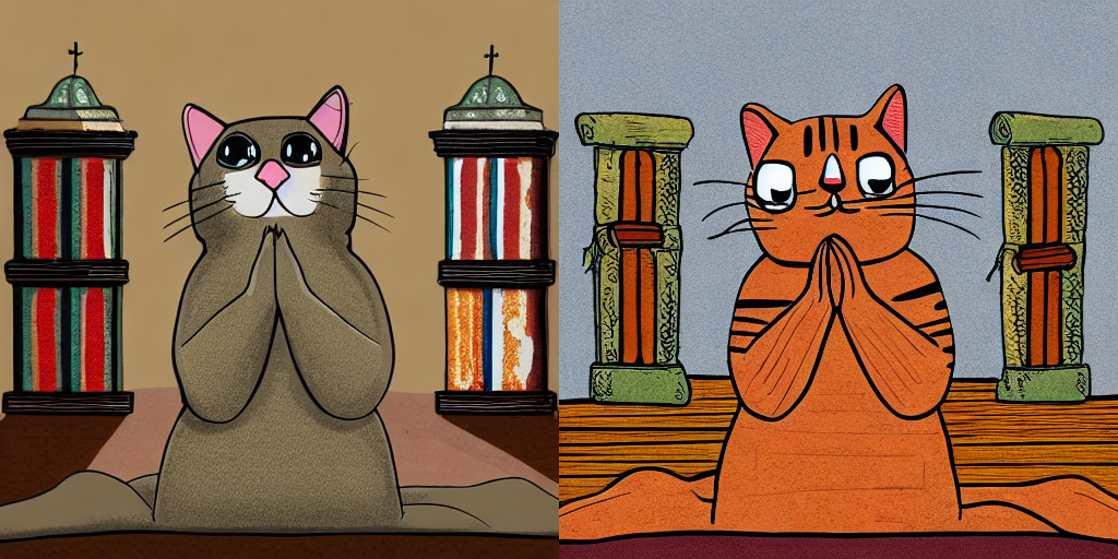 后面的图片里,前两张图片分别展示了原始输入、我们提取的Depth信息。第二行则是我们ControlNet生成的效果。我们可以将文生图视作重绘强度为1.0的图生图,可以看到,利用ControlNet,我们可以在保持原有构图的前提下,将猫咪转换为卡通风格。