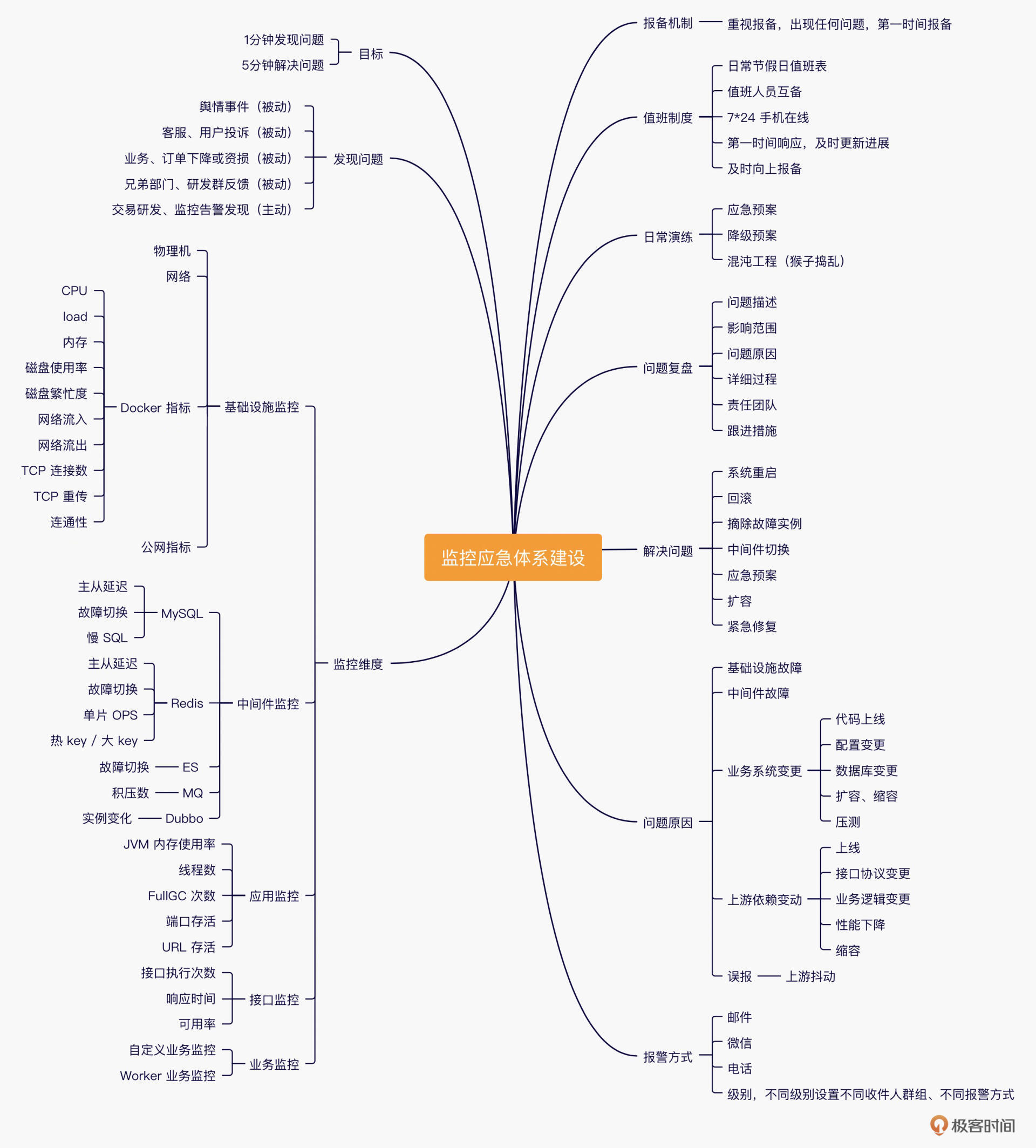 在搭建秒杀系统高可用时,需要有一套监控应急体系的支撑,各个大厂都会花大把的精力来重点建设。这里我也整理了监控应急体系建设的思维导图,供你参考,涉及以下几个重要的方面:目标、发现问题、监控维度、问题原因、问题解决、问题复盘、演练/值班/报备制度等。