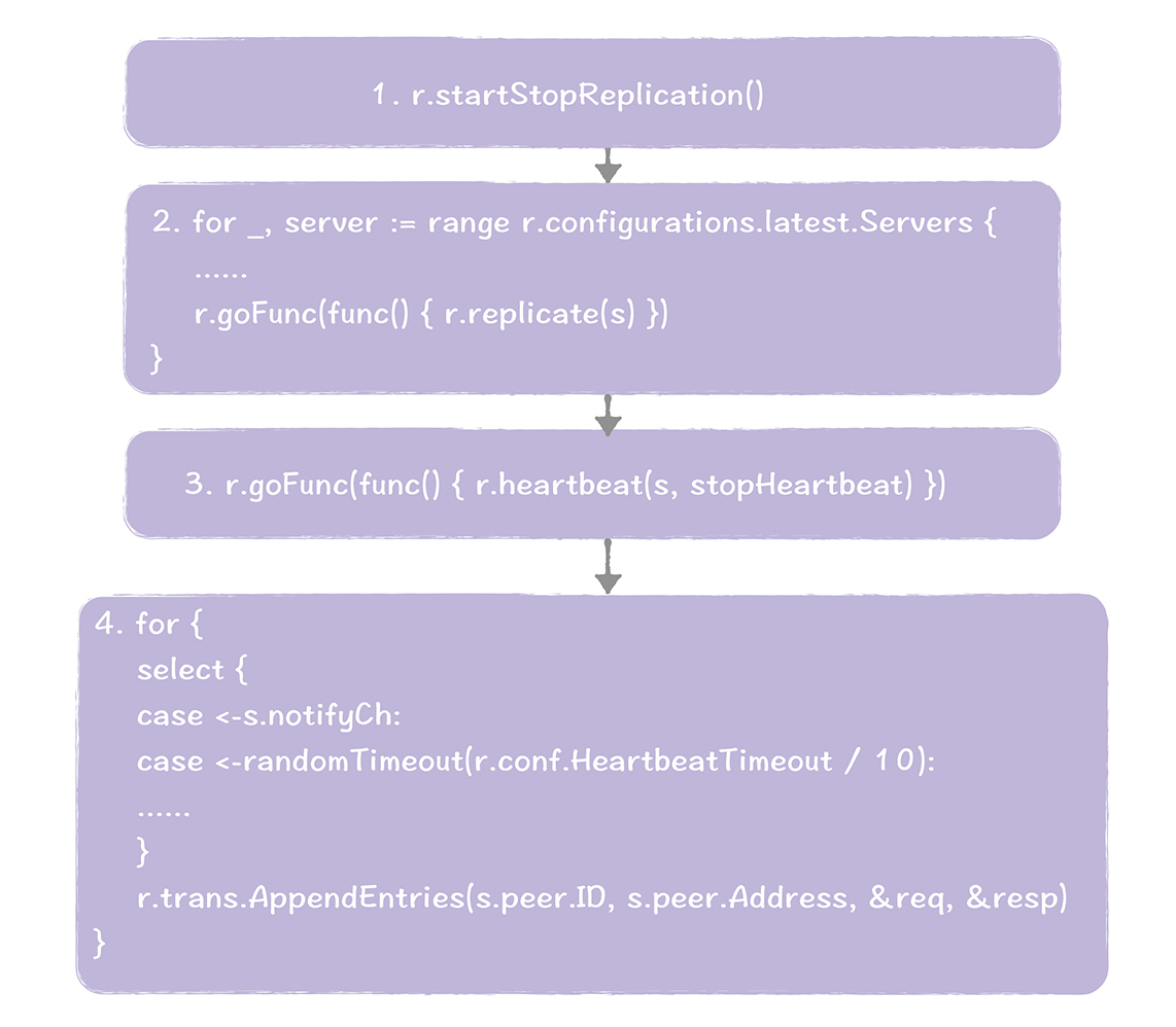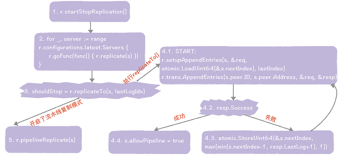 说完日志复制对应的数据结构,我们分步骤看一下,在Hashicorp Raft中是如何实现日志复制的。