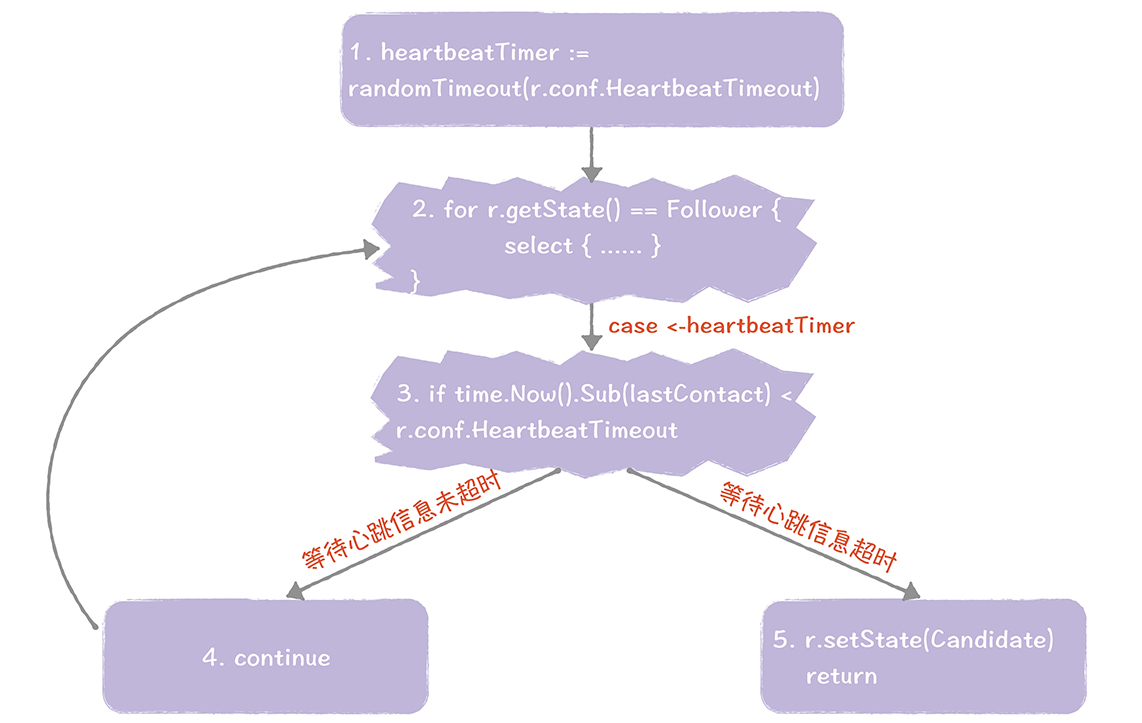 首先,在初始状态下,集群中所有的节点都处于跟随者状态,函数runFollower()运行,大致的执行步骤,就像下图的样子: