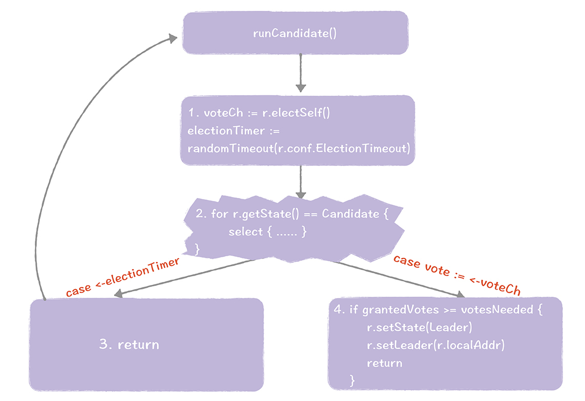 当节点推举自己为候选人之后,函数runCandidate()执行,大致的执行步骤,如图所示: