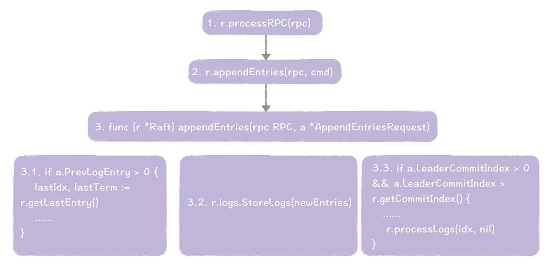 - 在processRPC()函数中,调用appendEntries()函数,处理接收到的日志复制RPC请求。