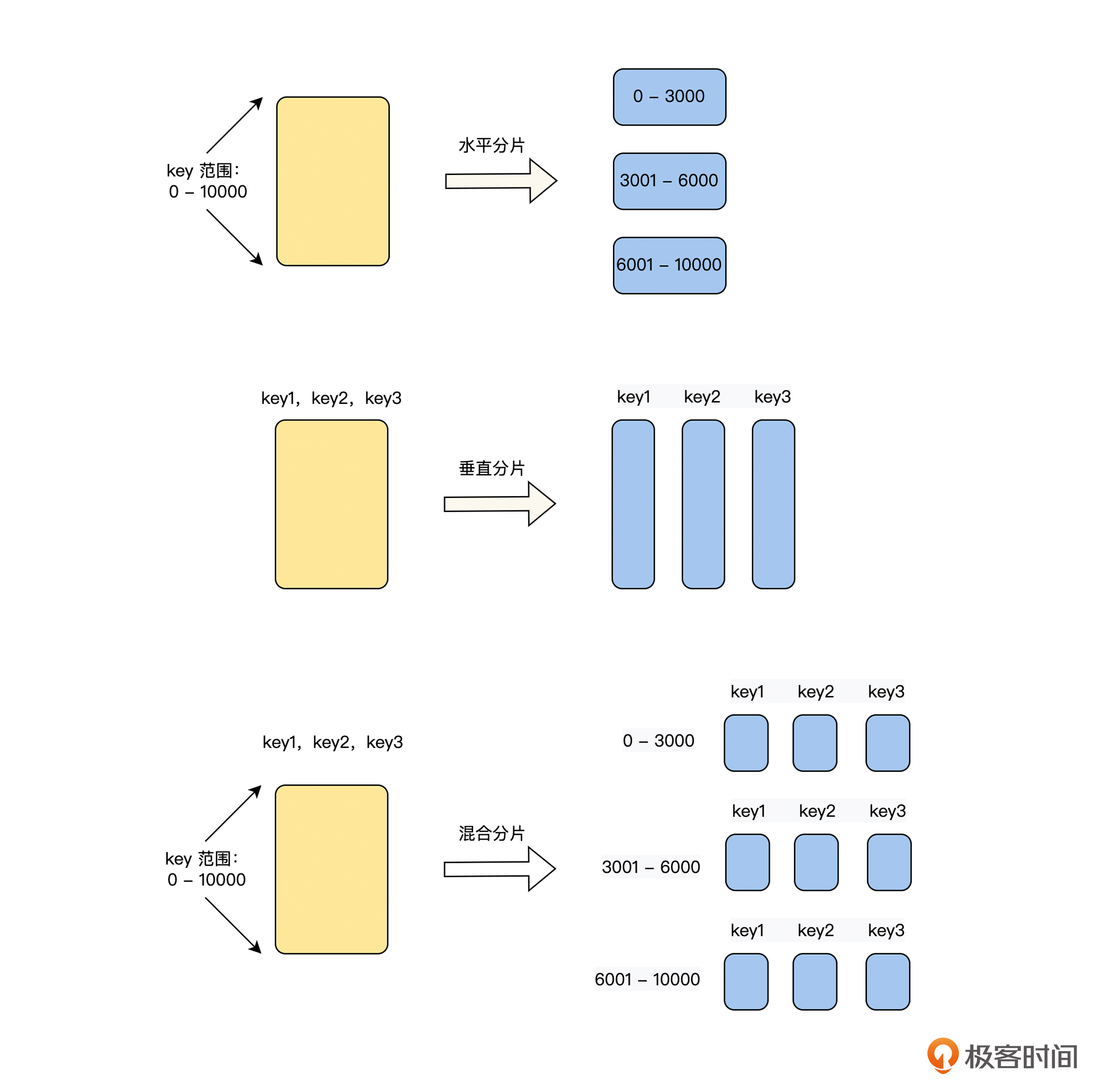 我们从图中可以看到,水平分片和垂直分片是通过数据切分的操作方向来区分的,而混合分片是它们的组合体。为了帮助你更好地理解,本节课我们将详细讨论水平分片的知识、原理和应用,下一节课我们再讨论垂直分片和混合分片的内容。